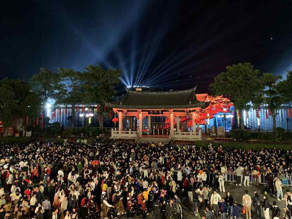 表演开始前半小时,潮州韩江两岸长廊上早已人头攒动。市民游客携家带口、呼朋唤友,游玩古城后纷纷至岸边寻找观赏点,等待灯光秀及无人机表演开始。