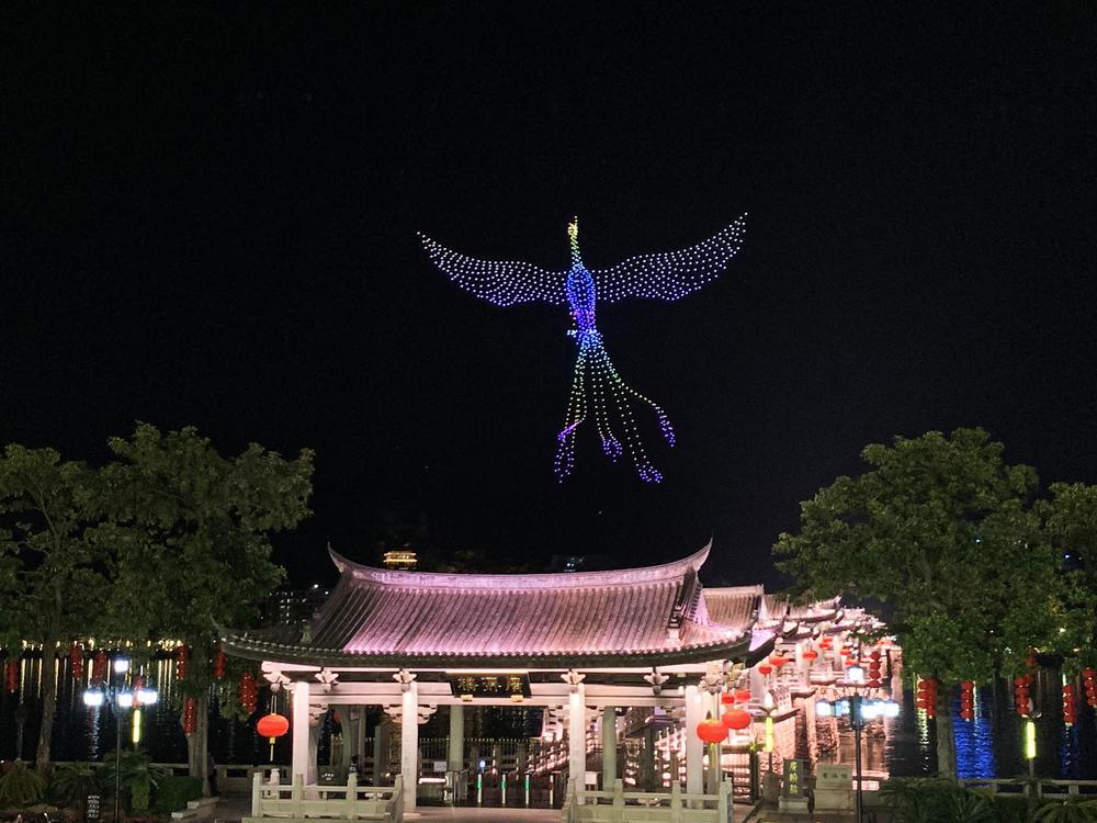 随着广济桥与笔架山的灯光变幻,潮州大锣鼓阵阵喧天,表演正式拉开序幕。千架无人机以斑斓色彩缓缓升空,瞬时成祥龙逐珠,瞬时化凤凰展翅,预示着在新的一年,潮州的发展打开了腾飞的翅膀。“龙腾凤城”的无人机表演演绎了龙凤呈祥,以科技、文化和艺术魅力展现潮州的新时代发展景象。