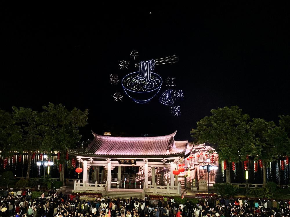 夜空中,由无人机组成的“韩愈”乘舟,逐步展开一幅幅潮州画卷:一碗满满当当的牛杂粿条、一块标致喜庆的红桃粿、一只端坐城楼、憨态可掬的“府楼猴”……通过传统与现代科技相融合,表演展现了潮州独具代表性的美食、文化元素,向市民游客讲述潮州的故事。
